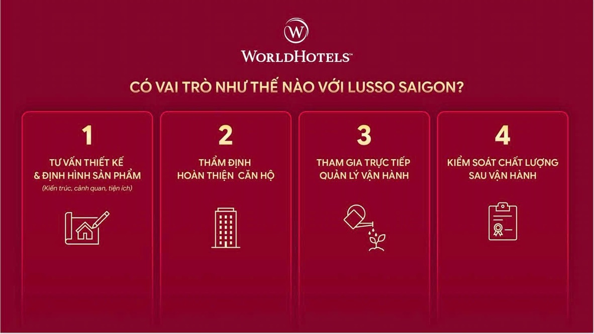 Đáng chú ý, sự hợp tác với WorldHotels (Mỹ) trong vai trò vận hành mang đến bảo chứng quốc tế về chất lượng dịch vụ và giá trị tài sản bền vững. Điều này định vị Lusso Saigon là lựa chọn hàng đầu cho cộng đồng chuyên gia và người nước ngoài sinh sống tại khu vực.