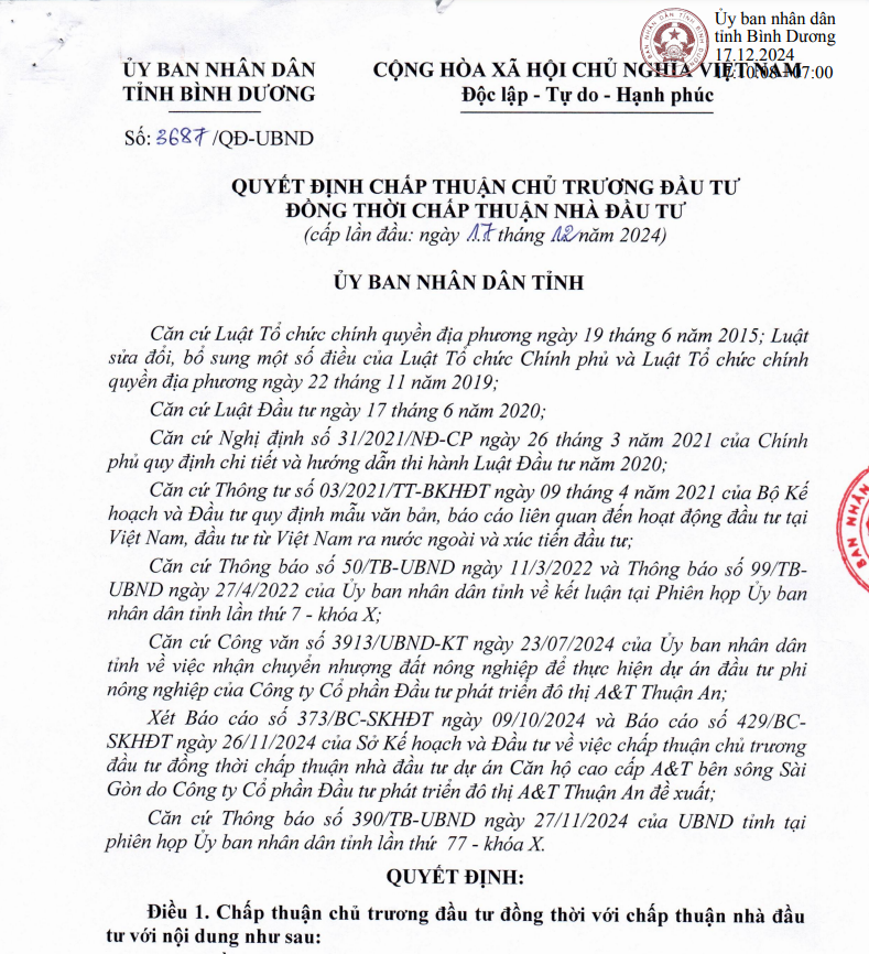 - Văn bản chấp thuận đầu tư dự án A&T Riverside
