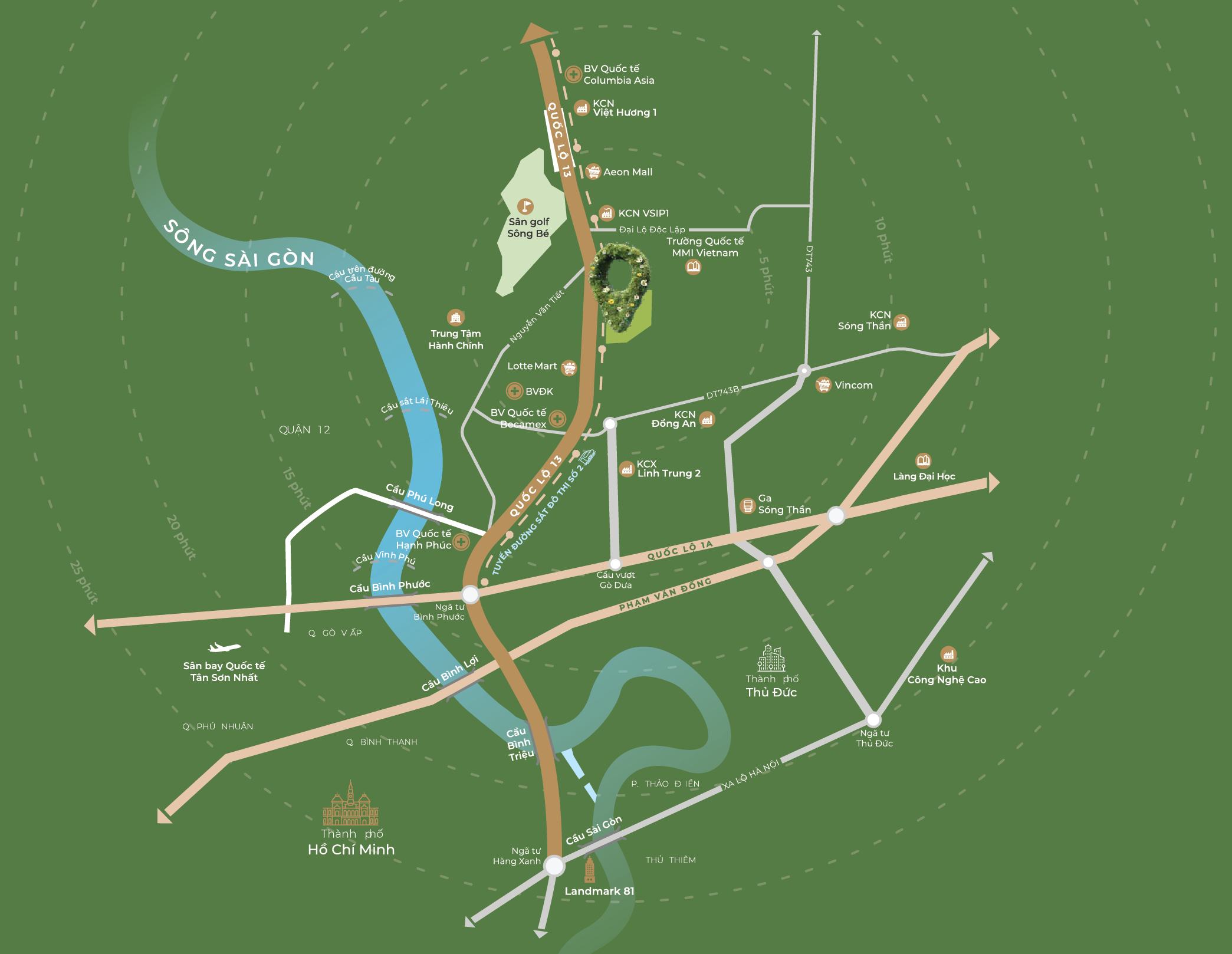 • Kết nối trung tâm làm việc và các khu công nghiệp lớn: Vị trí vàng trên Quốc lộ 13 giúp cư dân dễ dàng di chuyển đến trung tâm TP. Hồ Chí Minh để làm việc. Đồng thời, dự án cũng là điểm kết nối lý tưởng đến các khu công nghiệp lớn và hiện đại như VSIP 1, Sóng Thần, Việt Hương. Điều này không chỉ thuận lợi cho các chuyên gia, kỹ sư đang làm việc tại đây mà còn mở ra tiềm năng cho thuê căn hộ cực kỳ hấp dẫn.